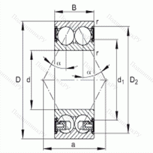 Основные размеры по DIN 628-3, двухрядные, контактные уплотнения с двух сторон, угол контакта α = 30°