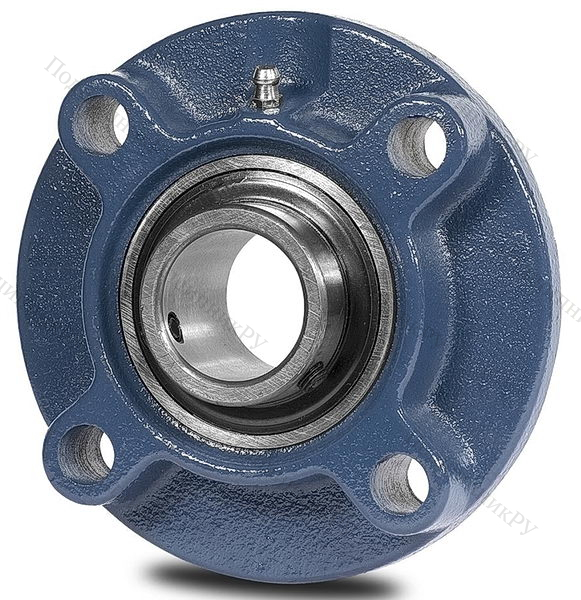 Фланцевая гильза из чугуна или стали оснащена корпусным радиальным шарикоподшипником UC-серии, имеющим внутреннюю обойму удлиненного вида и винтовой стопорной крепеж. Монтаж детали осуществляется методом подгонки.